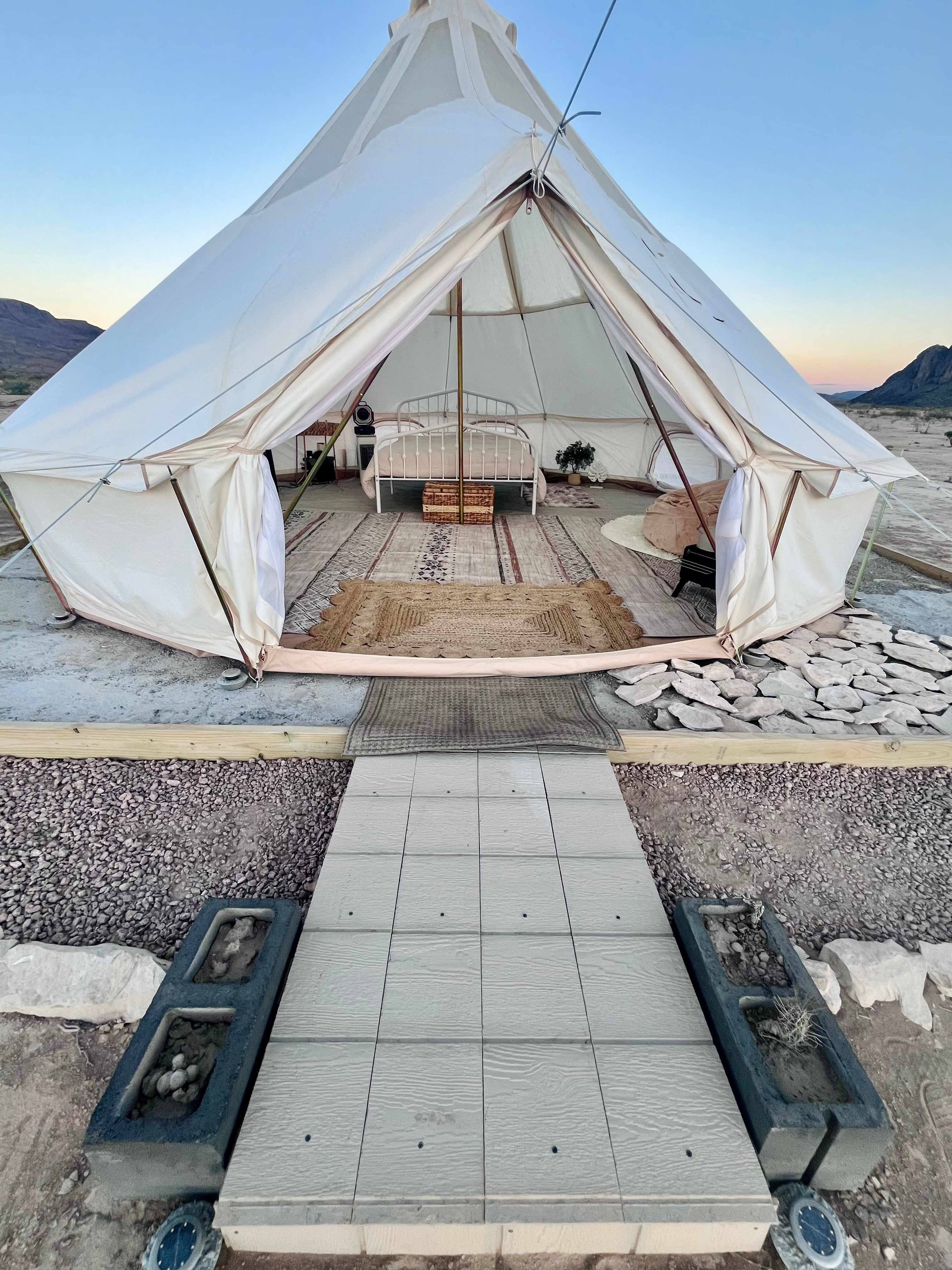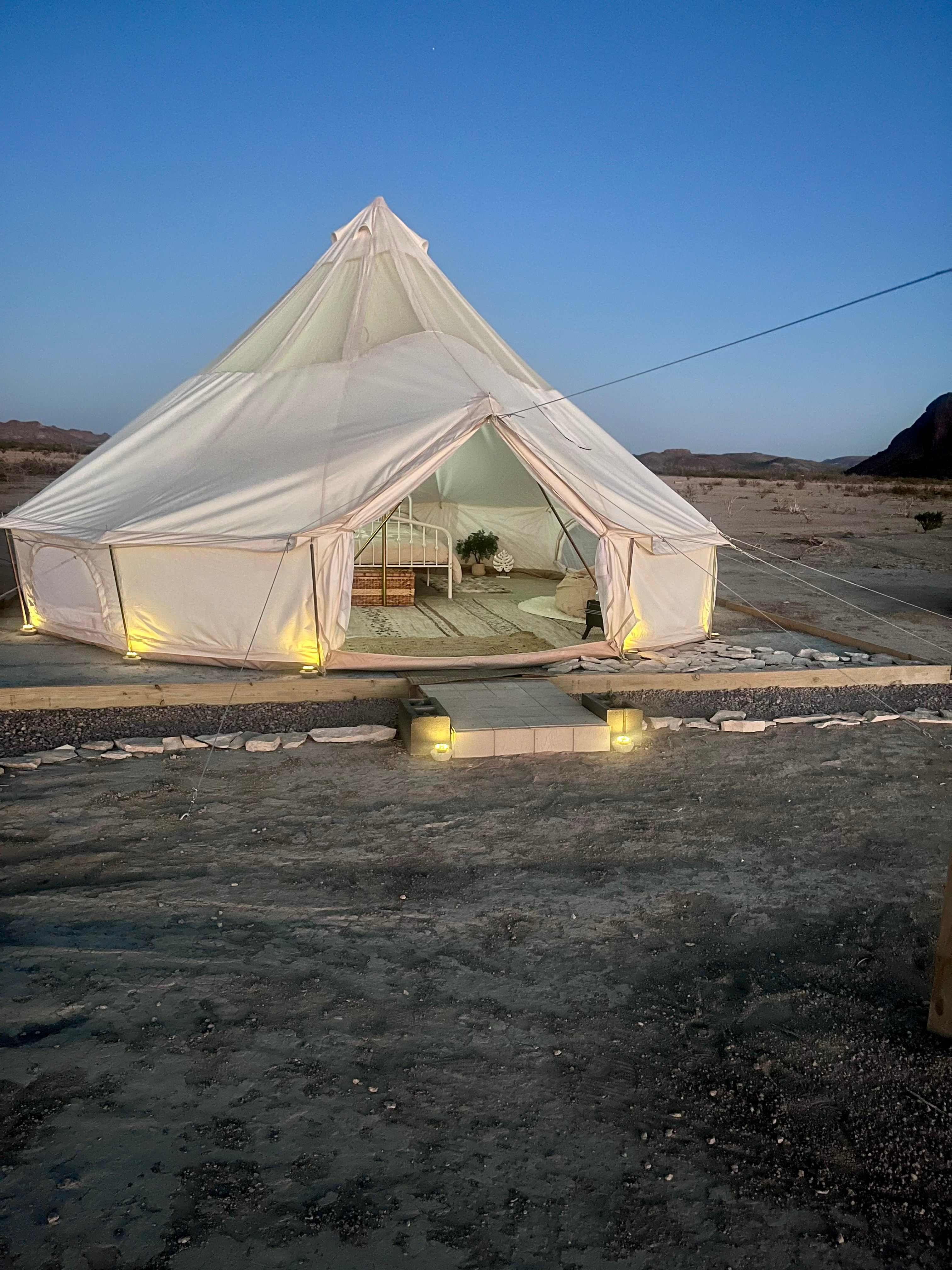 Escape to our Terlingua Stargazer Bell Tent — a one-of-a-kind desert glamping experience near Big Bend National Park and Ghost Town. Sleep under the stars through a clear ceiling, enjoy a hot shower, outdoor Blackstone griddle, hammock, and fire pit. An eco-friendly compost toilet is included. Perfect for adventure seekers and stargazers looking for comfort, nature, and unforgettable desert nights. Property Features: • Bell Tent Stay: Comfortable space for stargazing and relaxation • Camplux Water Heater & Compost Toilet: Enjoy hot showers and eco-friendly facilities • Outdoor Fire Pit Area: Relax around the fire with seating and a hammock for sunset views • Outdoor Kitchen: Blackstone griddle, utensils, and a large picnic table for meals under the sky • Games & Fun: Outdoor cornhole game for entertainment What We Provide: • Rechargeable fan with light, plus a standalone rechargeable light • Indoor wood stove to keep you warm • Mini fridge • Internet access (please note: signal may vary) WiFi: AIRBNB#1 Password: Terlingua2025! • Coffee French press, tea kettle, tea packets, coffee, sugar, and cooking oil • Blackstone griddle with utensils for cooking • Hot water shower (⚠️ Please be careful — the Camplux shower water can get hotter than a standard shower. Do not turn the hot water knob too far.) • Outdoor hammock and fire pit for relaxing under the stars What We Don’t Provide: • Bed sheets, pillows, or blankets — please bring your own bedding • Plates or drinking water — please plan accordingly Notes: • Our desert location is remote, so bring all essentials with you. • This is an off-grid experience — expect minimal amenities and a true connection with nature. Come for the adventure, stay for the stars!