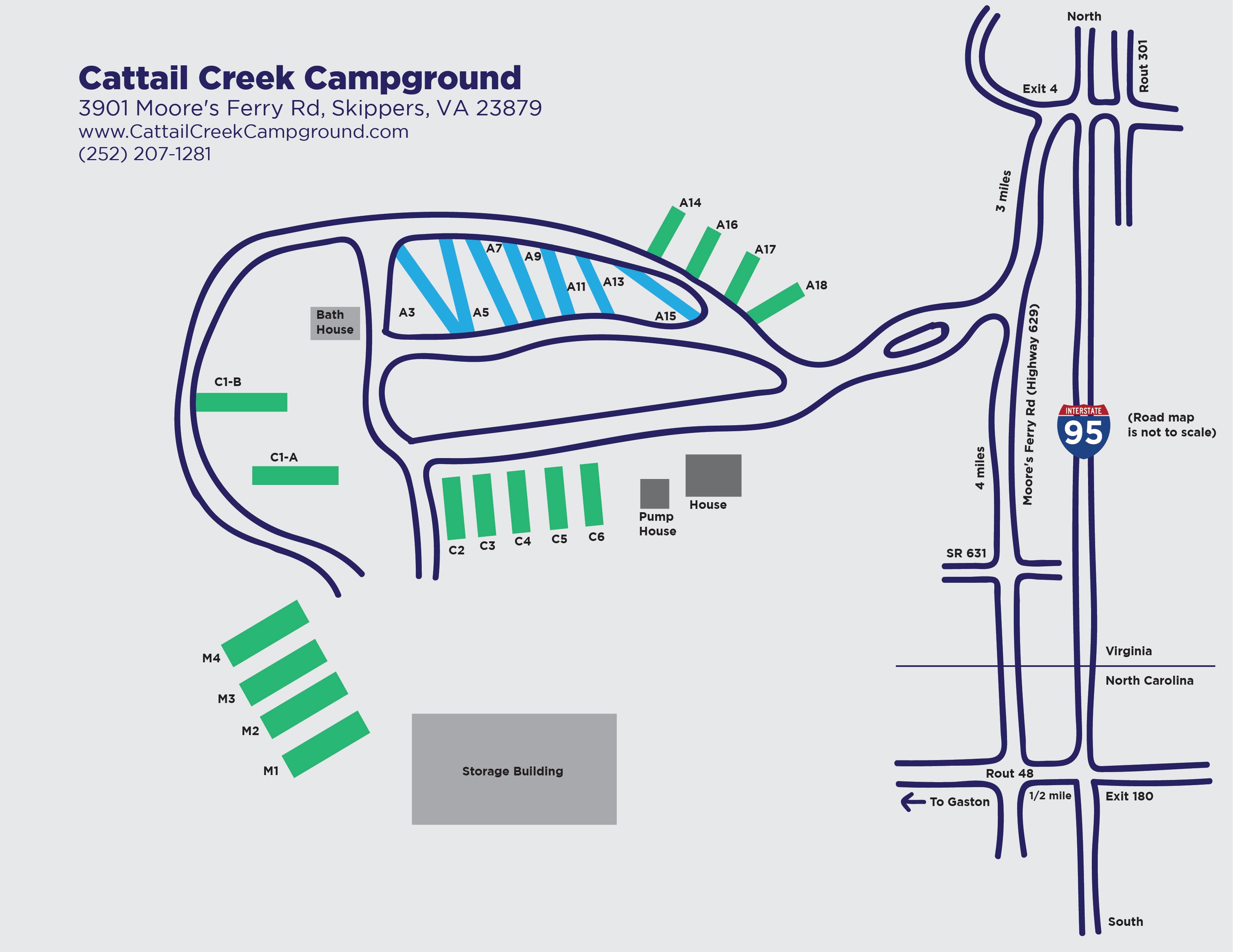 Located in South-East, Virginia, Cattail Creek Campground offers a family friendly camping experience for all ages. We take great pride in our family owned campground that has been open for nearly 40 years. Cattail Creek is located 5 minutes of I-95 at the Virginia and North Carolina border. Come enjoy our tranquil setting while only being minutes from large rest areas, truck stops and restaurants. We have 40 full service 50-amp hookups for RVs and campers of all sizes. Nightly, weekly, and long term sites are available.