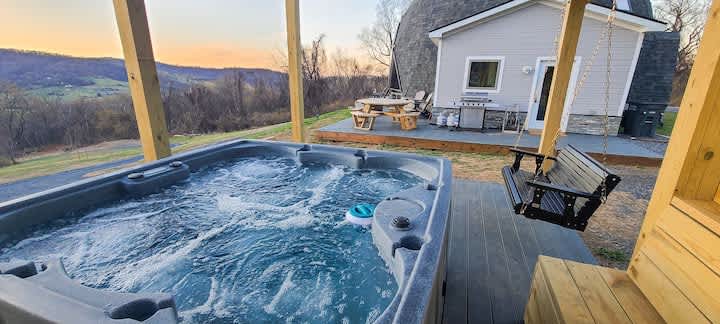 Tucked away in the heart of Shenandoah, this one of a kind geodesic dome home is a beautiful escape and truly an oasis for all who visit. Welcome to Lunar Lookout of Front Royal! ⭐️ A true architectural gem nestled atop the Blue Ridge Mountains. With close proximity to Shenandoah National Park, this dome is the perfect balance between convenience and privacy. Our geodesic dome is perfectly situated as you are surrounded by mountains and wildlife while only being a short 10 minute drive to town. Immerse yourself in the great outdoors with a plethora of activities, including hiking, biking, and exploring natures wonders nearby. Located in Warren County only an hour and a half outside of Washington D.C., the dome is minutes from the Northern VA 4H Center, Appalachian Trail, Shenandoah River and Skyline Drive. This new build was thoughtfully constructed with guests comfort in mind. From the moment you pull in the driveway, you are greeted with beautiful architect and modern design. There are breathtaking views from every room, and the domes wraparound porch is a beautiful place to relax and take in the sunset. Indulge in relaxation and reflection in our lounge room, where glass windows meet beautiful wooden structure that provides a serene atmosphere and invites abundant natural light. Retreat to one of our three spacious bedrooms that provide additional natural light and comfort. Lunar Lookout sleeps 6 adults, with two bedrooms on the main level and one upstairs across from the loft. The main level features a master bedroom and king bed, with a beautiful en suite bathroom attached. The second bedroom on the main level has a queen bed and a private bathroom across the hall. The third bedroom in the dome is located upstairs across from the game room loft area, with its own private bathroom as well. Each bedroom has a smart TV and a spacious closet for your belongings. This unique and captivating property features a wine cooler and filtered countertop ice maker that refills itself! You will also find a level 2 EV charger for your convenience. Stay connected with free WiFi or unplug and unwind to take in nature around you from the hot tub. Relax on the wraparound porch with a cup of coffee or glass of wine by the fire table overlooking the mountains.