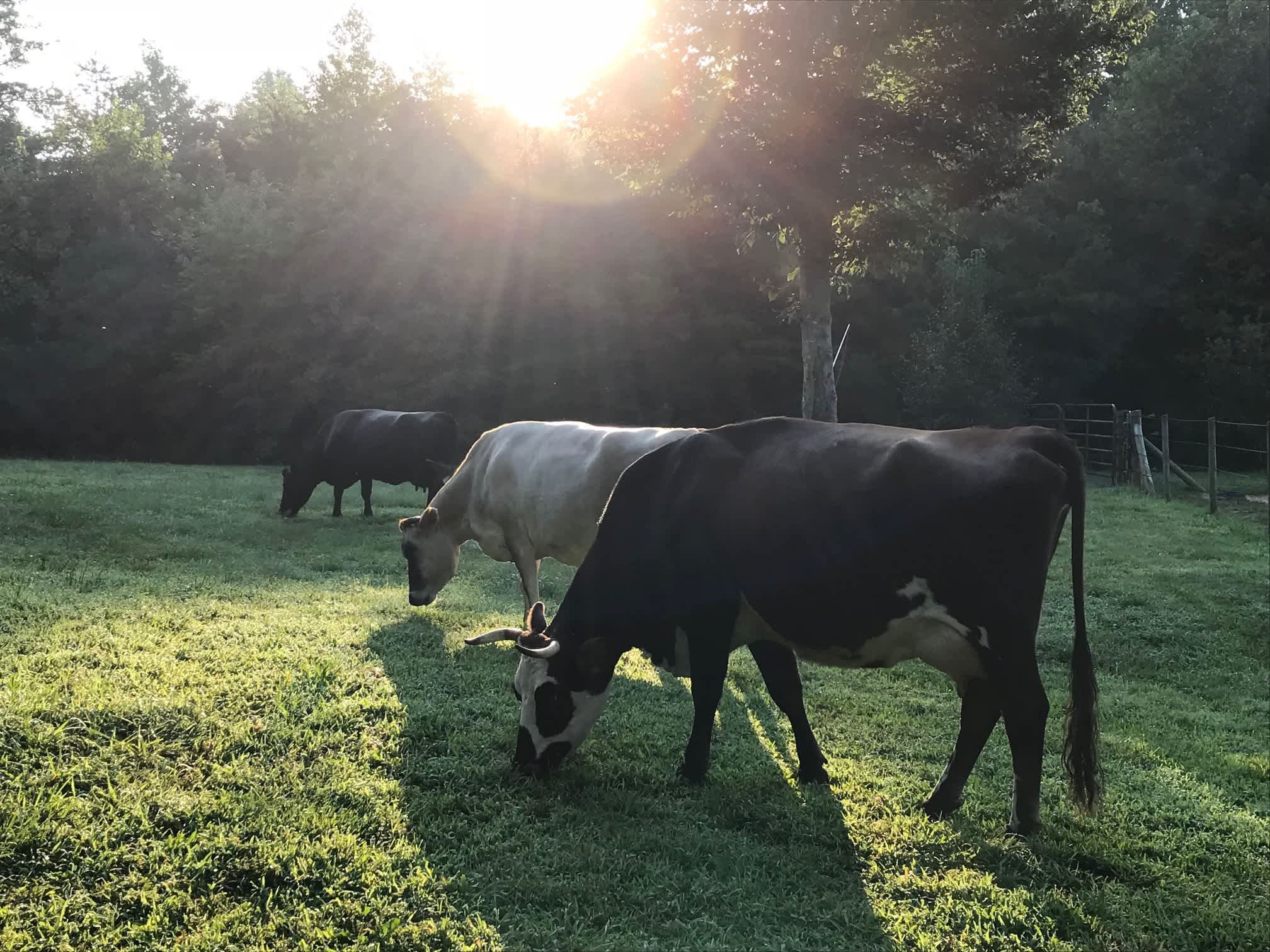 We made any meals on the wood stove, and enjoyed fires in the awesome firepit. Laura made sure the porch was stocked with firewood before we arrived. The Twin Oaks hammock (nice) overlooks the meadow and was perfect for reading and napping. The outhouse was as clean and inviting as an outhouse possibly could be. There were spare linens supplied and the bed was comfortable and came with pillows. We didn't have to prepare much as the cabin was supplied with all of the basics, even an igloo of potable water out back. The dish washing set up was easy to use. Some fun creatures were seen like deer, hawks, frogs, and lots of cool insects. Crickets sang us to sleep each night. In the morning the sun reflects off of the creek onto the trees nearby.