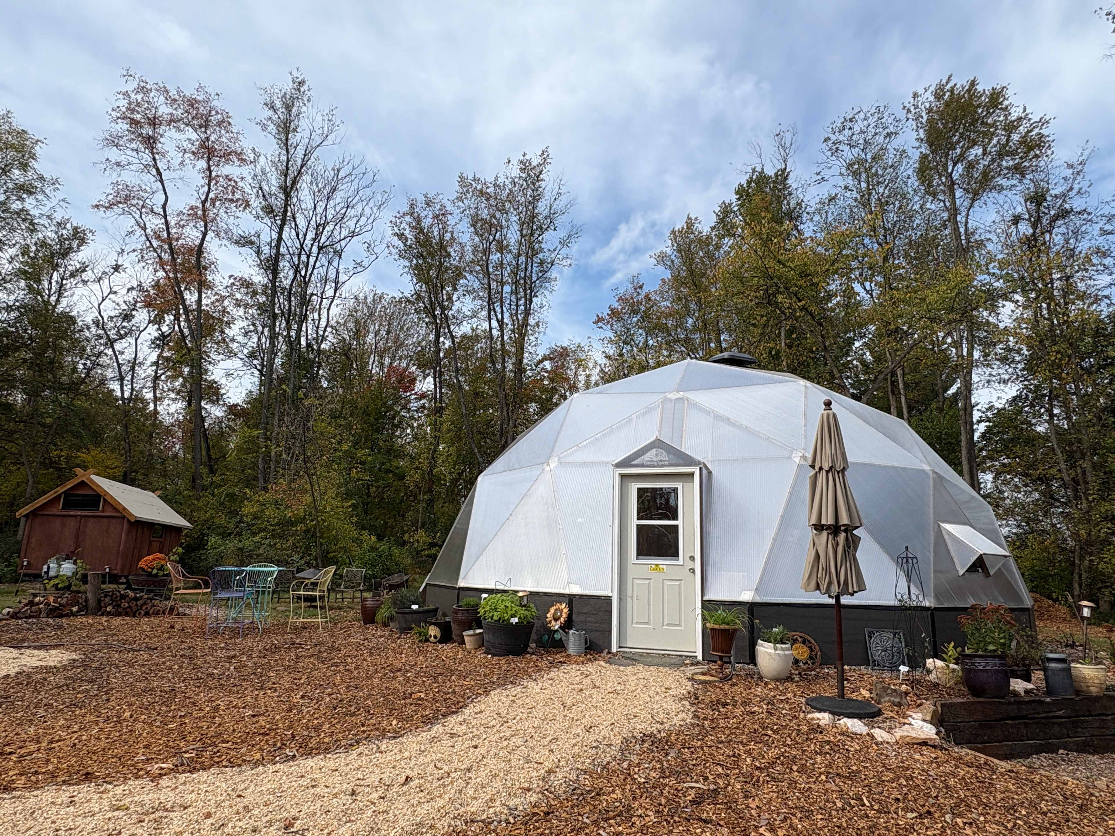 Nestled in Western Loudoun Wine Country is a unique 4-acre glamping site featuring a 33-foot-diameter geodesic dome greenhouse, a rustic tiny home cabin with a viking flair, and a fire pit campsite area for a few tents. Secret DC promoted Lovettsville as the most “laid-back” town in America in an October 2025 article. Steven Bryant loves gardening and caring for plants and is currently laying the groundwork for a small native nursery. Rebecca Bryant is a licensed massage therapist and uses the dome as her session space when it’s not being rented out for overnight accommodations. Other features: • Easy access to parking. • Easy access to neighboring bike paths. • A 3-minute drive to restaurants, convenience stores, a grocery co-op, a community center, and more. • Surrounded by a plethora of small farms, wineries, distilleries, breweries, pubs, and equestrian riding trails. • Located 50 miles west of Washington, D.C., and just a 2-minute drive to the Potomac River and C&O Canal Towpath. Only 15 minutes from Harpers Ferry, WV, and close to biking, whitewater rafting, and tubing adventures. • The perfect getaway for those craving a peaceful, therapeutic break without sacrificing modern conveniences. Ideal for beginner campers, wine enthusiasts, and cyclists. • None of the rental sites have air conditioning, but the owners can supply a fan(s) by request when weather is very hot (above 85 degrees). None of the rental sites have built in heating, but a space heater(s) can be supplied by request when weather is very cold (below freezing). Both the Geodesic Dome and the Tiny Home Cabin have electricity. There is no plumbing in either structure.