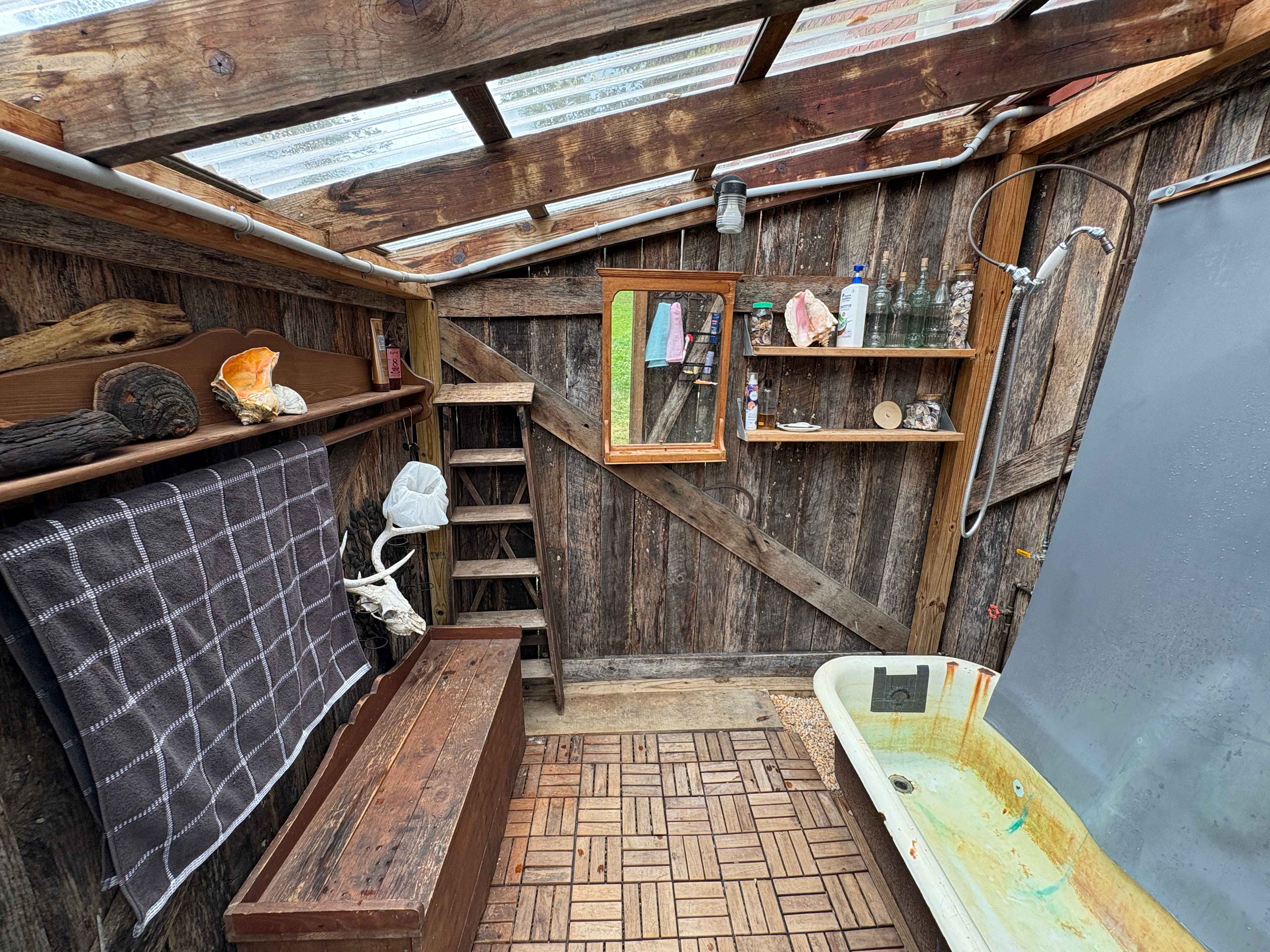 The cabin features one queen sized bed and room for 1 more individual cot or sleeping pads, but it's a tight fit for 3, so we recommend 2 at a time for booking. The interior, including the bed, is 13.5 feet long by 6.5 feet wide. It's only a short walk to the outhouse. Guests have raved about how cute and comfortable it is! There are motion sensor lights installed for night-time bathroom visits. Cooking can be done outside over a brazier or the campsite fire-pit. Guests are also welcome to bring their own camp-stoves and other outdoor cooking gear as well as order delivered food. There are also several local restaurants within a two mile radius. From mid-April to mid-November there is a hot and cold running outdoor shower located a very short walk away with excellent water pressure. Free firewood is available for the fire-pit and designated braziers.