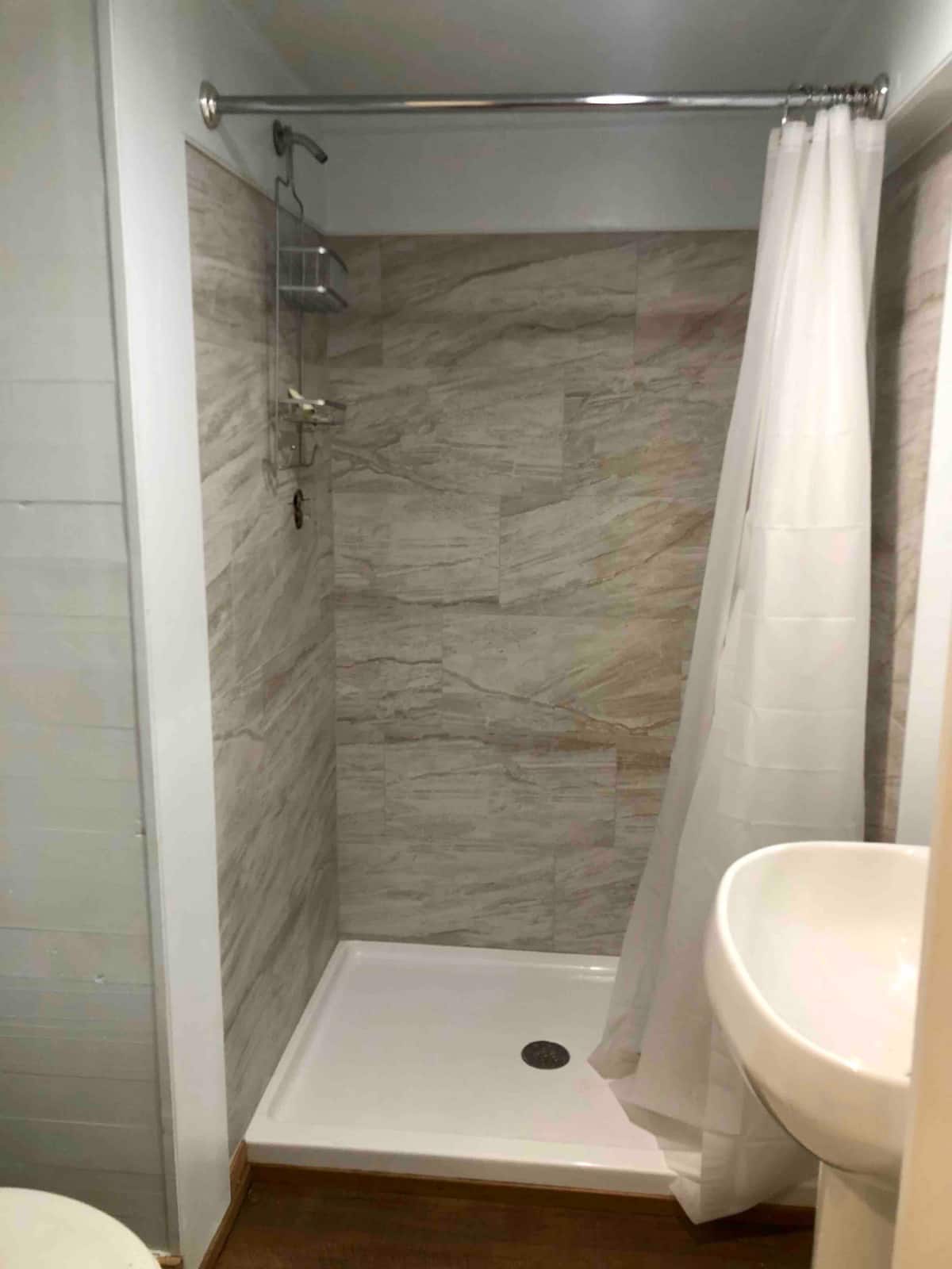 There is only one bathroom in this tiny home, but it is big enough for two. It’s such a clean and crisp little space. The water was hot , which in my experience doesn’t often happen in small cabins like this. It made the stay here so much more relaxing. The hot water washed all of my stress away.