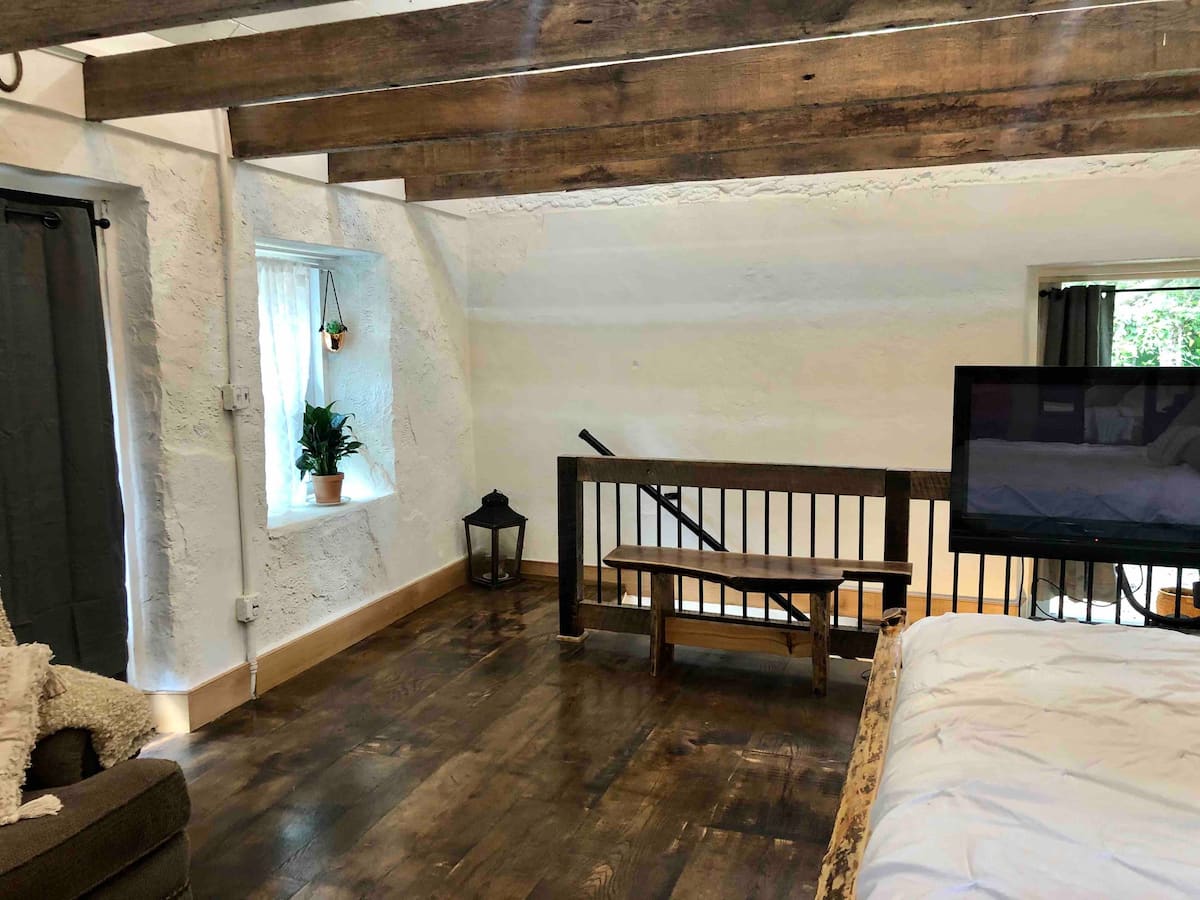 As we opened the cabin door for the first time, we were instantly drawn in by the interior of the cabin. It is beautiful! The colors are calming and a perfect backdrop for any kind of visit you may have planned. The windows let in all of this amazing natural light which is reflected off the white walls. It makes the space seem so much bigger than it is yet cozy at the same time. As your eyes start to wander across the main room, you can see the impeccable attention to detail the owners went through to build this haven. The woodwork is amazing! The beams and whitewashed ceiling, the amazing wood floors, the railing….it all combines into such a restul space. That feeling of being back in time in another place just washes over you.