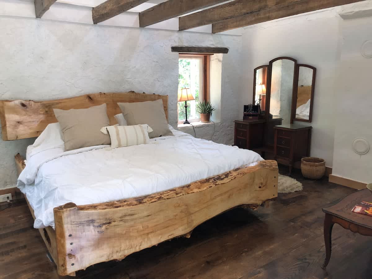 As your eyes continue to skim across the space, they will immediately be drawn to the amazing bed that is the centerpiece of the main room. The craftsmanship of the head and footboards is astounding. Paired with the white linens and the neutral throw pillows, it looks so relaxing that you can’t wait to lay down and try it out. You won’t be surprised when you sink into the comfy mattress. It really is the icing on the cake to know that after a day of exploring wine country you can lay down to rest there.