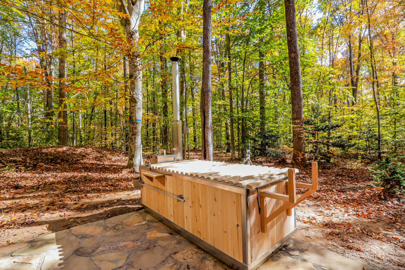 Glamping at its absolute finest. This glass mirror cabin allows guests to view out but not in. Unwind in the outdoor two-person cedar sauna, relax in a cedar wood burning hot tub that also doubles as a cold plunge, cook on a Pyro Tower grill and pizza oven combo (Pizza dough, sauce ,cheese, and pepperonis are included with every stay), enjoy the tranquil natural stone water feature, warm up by the outdoor fireplace, behold the pollinator garden attracting butterflies/hummingbirds. Landscape Lighting allows the amazing outdoor living space to be enjoyed through the evening. Check out the 2 miles of hiking/biking trails leading to a mediation/breathwork garden that runs along a natural spring and is also a certified wildlife habitat! Cabin has great A/C system as well as a heated floor to keep your feat warm in the cold months.