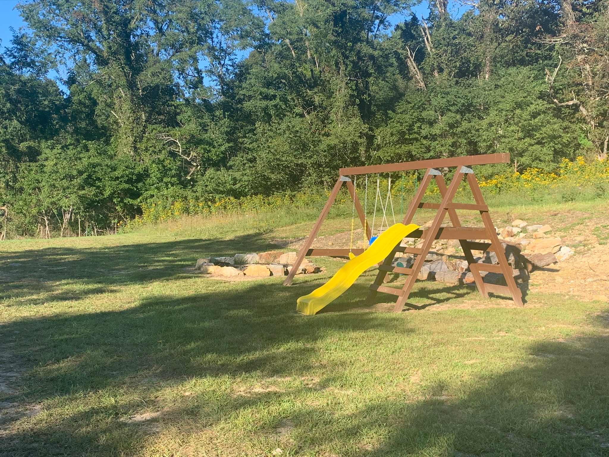 The .5 acre campsite is an open area of flat land covered mostly in grass with spectacular views of the mountains! This area has a large fire pit, picnic tables, grill, swing set, volleyball net, and space for other outdoor games! Bathrooms are within walking distance or you can bring a golf cart for traveling to the bathroom and other locations on the property. We have goats, cows and dogs for you to visit. There are trails for hiking and biking. There is a lookout you can visit that includes a shelter for picnics and grilling. There is a pond for fishing and canoeing.