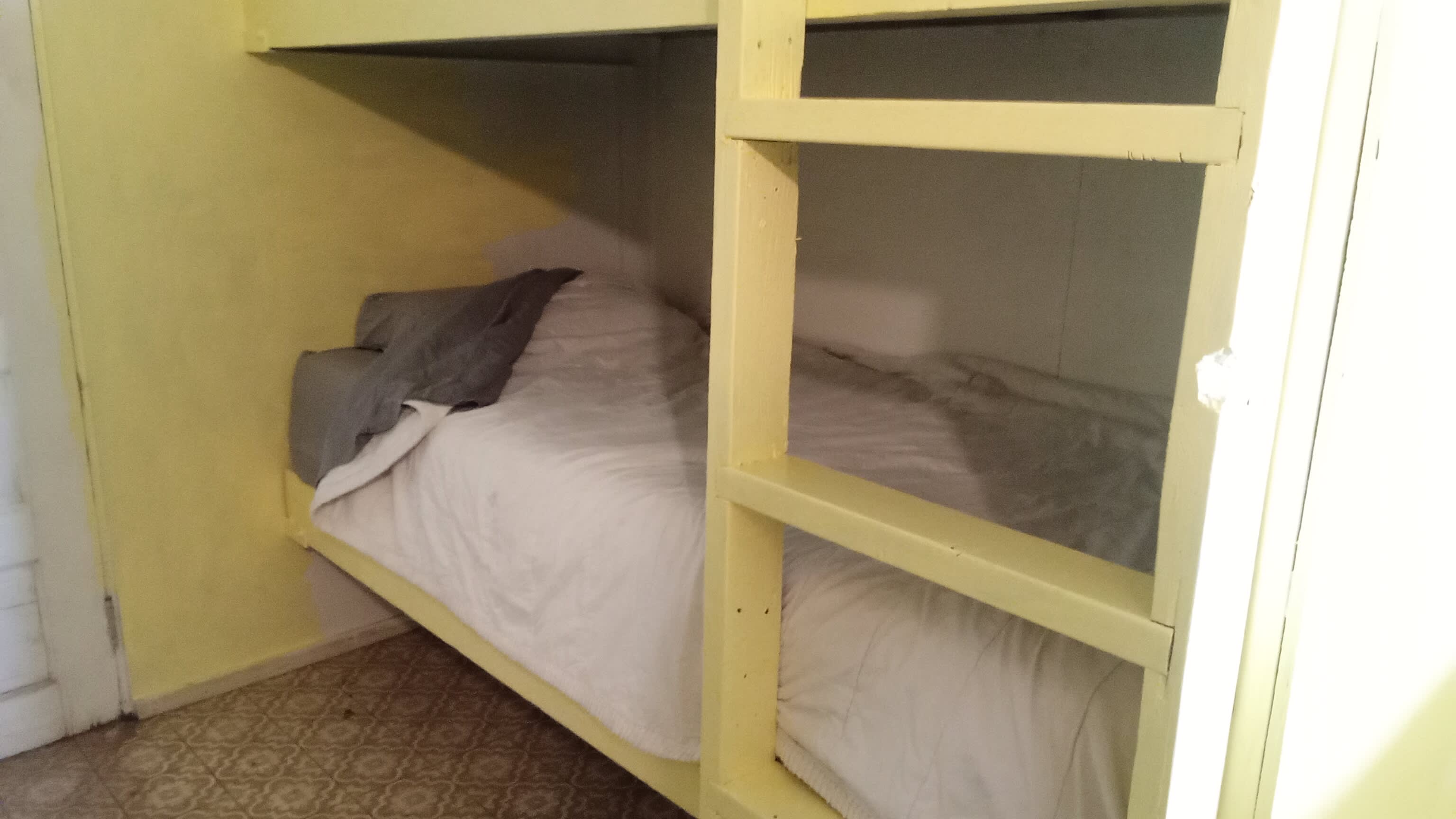 The cabin is an old pickers shed, and the hosts have made it very comfortable for people needing short term lodging. One double bed, and two bunk beds could sleep 4. Room had a working air conditioner and a microwave, and I believe that a refrigerator outside of the cabin could be used for food storage. (We had our food in an ice chest.)
