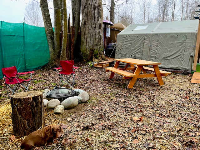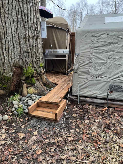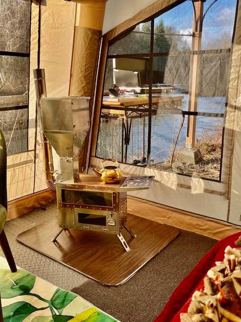 Perfect for year-round camping with only a suitcase required. as all camping necessities are provided and comfort and quiet abounds. Dungeness Castle is "on the "mainland" with easy access to the river (you can't get any closer) and the four seasons tent located on a 500 sq ft footprint where the rushing river will be all you see and hear. The private site is fully equipped with a large fire pit, with grill, 2 chairs, picnic table, toilet tent, outdoor shower, and sink with propane hot water heater. Amenities inside the tent include a plush queen bed, pellet heating stove that will burn for 7 hours, propane camp stove, electric toaster and coffeemaker, refrigerator/freezer. WIFi is available with phone charging panel. Perfect for a relaxing camping experience or a riverside walk downriver to the Railroad Bridge Park, or fishing, bird watching, and swimming are available right outside your door.