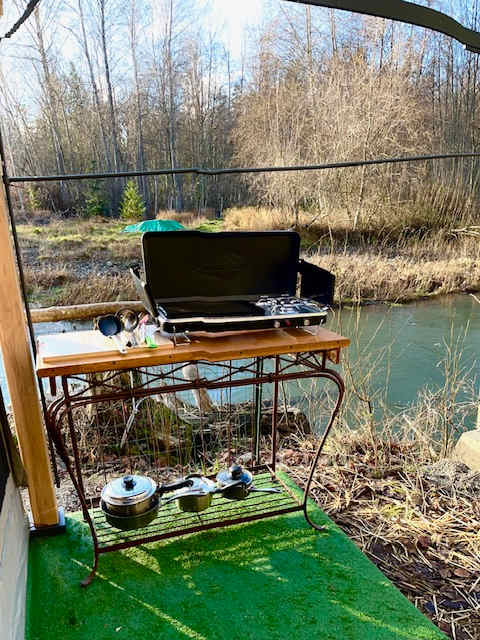 Camping in style—bring only your suitcase. and queen bed sheets - all camping equipment is provided. $95 per night for 2 people, Kids 0-3yrs$0, Kids 3-4-17$20., Extra Adult$40 Dungeness Castle is a cozy 12 × 12 Four Seasons tent that is fully furnished with a plush queen bed, pellet heating stove, refrigerator/freezer, propane camp stove & oven, electricity, propane hot water, shower, and restroom tents and peaceful surroundings and beautiful river views and trails and swimming, fishing and hiking opportunities - everything you need for a great camping experience with little to no hassle There’s no need to spend days packing gear, transporting equipment, or setting up camp. It’s all right here for you.Perfect for year-round camping with only a suitcase required. as all camping necessities are provided and comfort and quiet abounds. Dungeness Castle is "on the "mainland" with easy access to the river (you can't get any closer) and the four seasons tent located on a 500 sq ft footprint where the rushing river will be all you see and hear. The private site is fully equipped with a large fire pit, with grill, 2 chairs, picnic table, toilet tent, outdoor shower, and sink with propane hot water heater. Amenities inside the tent include a plush queen bed, pellet heating stove that will burn for 7 hours, propane camp stove, electric toaster and coffeemaker, refrigerator/freezer. WIFi is available with phone charging panel. Perfect for a relaxing camping experience or a riverside walk downriver to the Railroad Bridge Park, or fishing, bird watching, and swimming are available right outside your door.