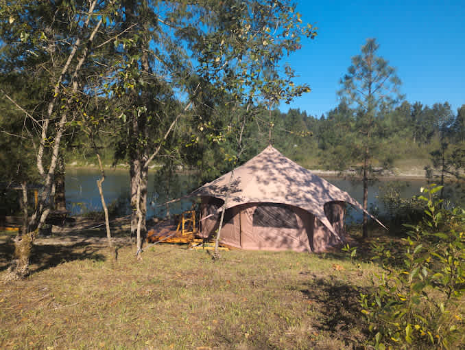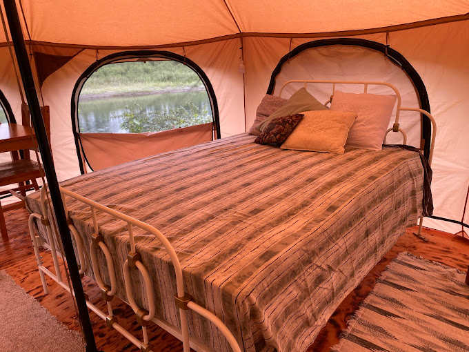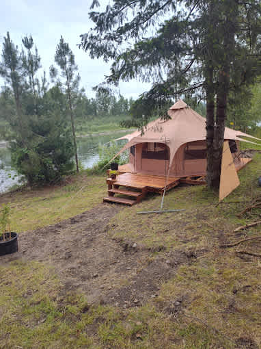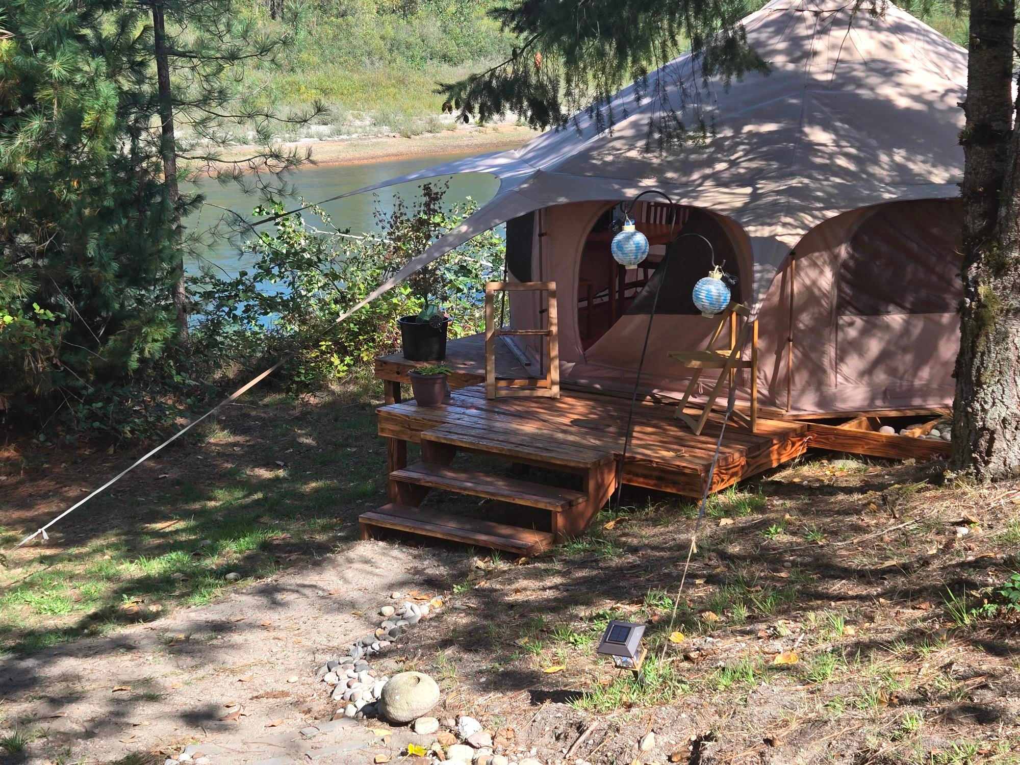 Privately owned campground, featuring canvas-style yurt tents and bring your own gear tent sites. Located on a 56-acre working ranch and Cowlitz River frontage with sweeping views of the water. Additional amenities include firepits with complimentary firewood, playground area, outhouse-style bathrooms, and multiple viewpoints along the river. Wildlife often sighted, including beavers, deer, golden/bald eagles, osprey, and seals/seal lions (seasonal). Fishing allowed, bring your own gear.