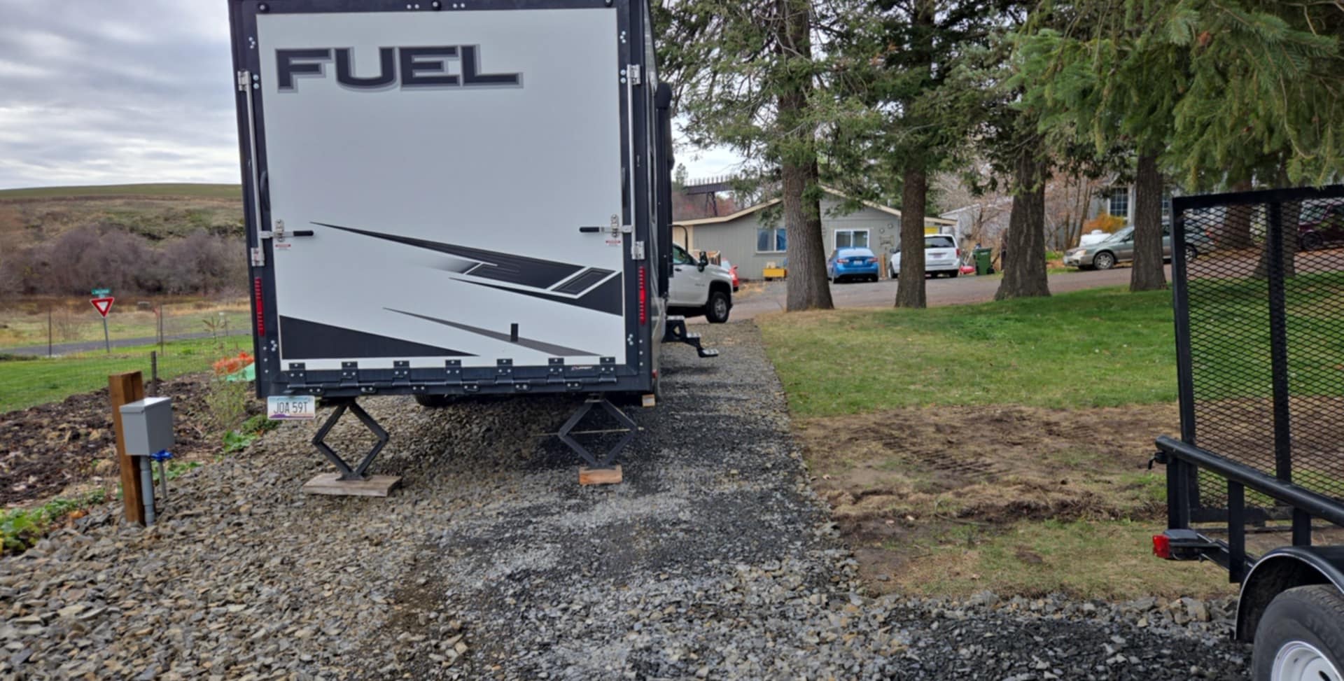 The second plot within Tekoa has been converted into an RV pad suitable for a 37 ft toy hauler, with both 50-amp and 30-amp hookups available. Features include a leveled rock pad, electric and water hookups, and access to a dump tote, with a free dump station on site. There are two hookups—30-amp and 50-amp—and the site becomes a complete pull-through when open. A water hookup is provided. There are no bathroom accommodations unless you book the toy hauler (a 2023 Heartland Fuel, 37 ft). A fire pit is available for either hookup, and trash disposal is provided.
