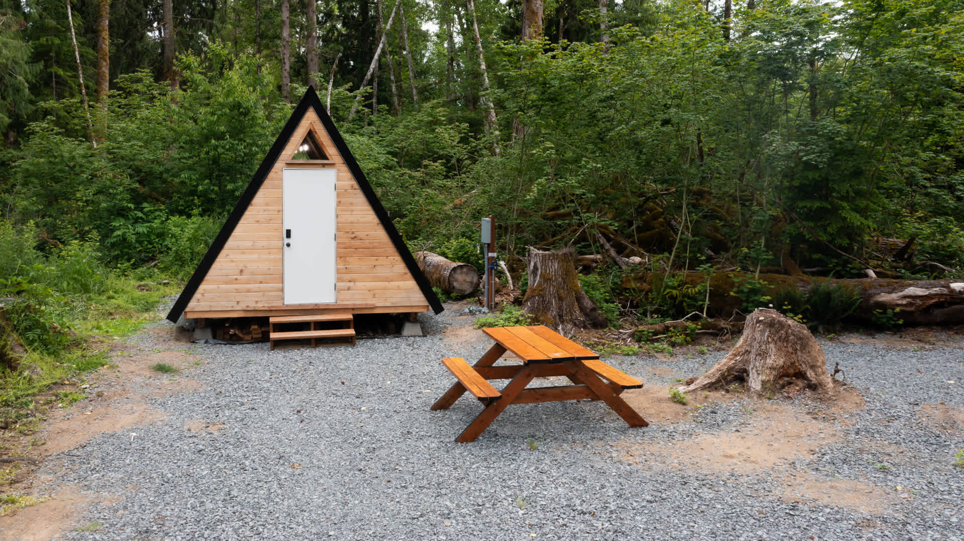 "Osborne's Den" (tiny, tiny A-Frame Cabin 200 Square Feet) is nestled on this quaint 1/2 acre lot. Just minutes from Mt. Rainier National Park. Basic power is inside the building (for charging phones and basic wall outlet plug in devices) and a water spigot and electrical outlet just outside. There is a queen sized bed (***BRING YOUR OWN BEDDING***). There is a shared Honeybucket Toilet just across the driveway. This property is shared with a RV/Camping spot on the other side. So you may have "neighbors". There is fire pit, chairs and picnic table... perfect for relaxing. Short 10 minute walk/hike down to the Nisqually River (see map in photos) Restaurants/shops/coffee/stores 1 mile away! Have you ever played Hammerschlagen? You will if you stay here! The rules are posted on "The Table". ENJOY!!! Please read the listing details carefully before booking. ***IMPORTANT NOTES*** - BEDDING NOT PROVIDED... no blankets... no pillows... no sheets... just a comfy queen size bed - There are no cooking methods inside or outside the cabin... please please please DO NOT use your stoves/BBQs/cooking devices inside the a-frame - There are no utensils, pots, pans, dishes... you need to bring your own - There is only cold water outside. There is no hot water. And there is NO water/plumbing inside the cabin - Leave No Trace - please take ALL garbage with you when you leave (this helps us keep costs down for you!) Enjoy your Tiny Camping Experience in Osborne's Den!
