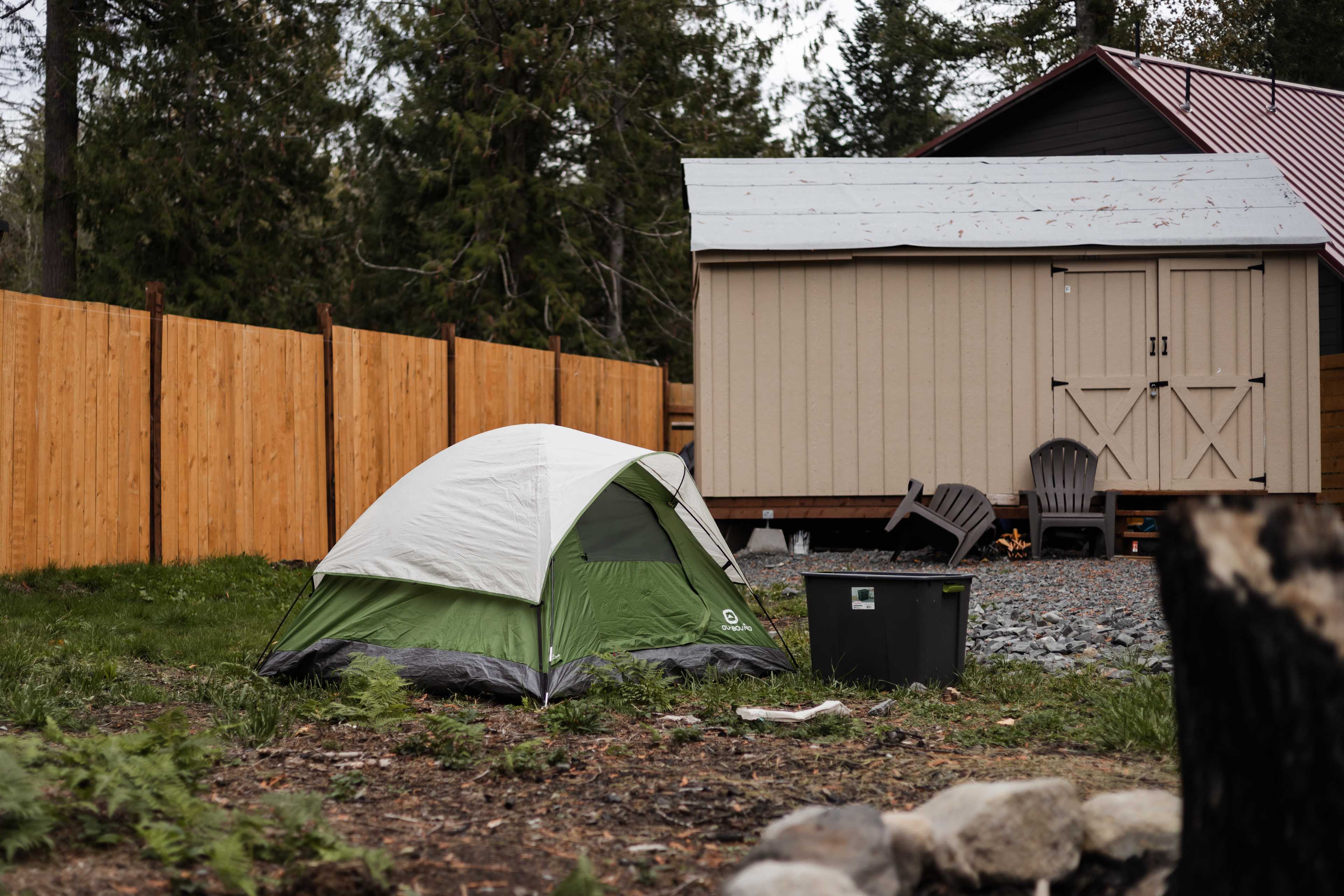 There are several good tent sites, and we set up our storage tent between the driveway and a fence.