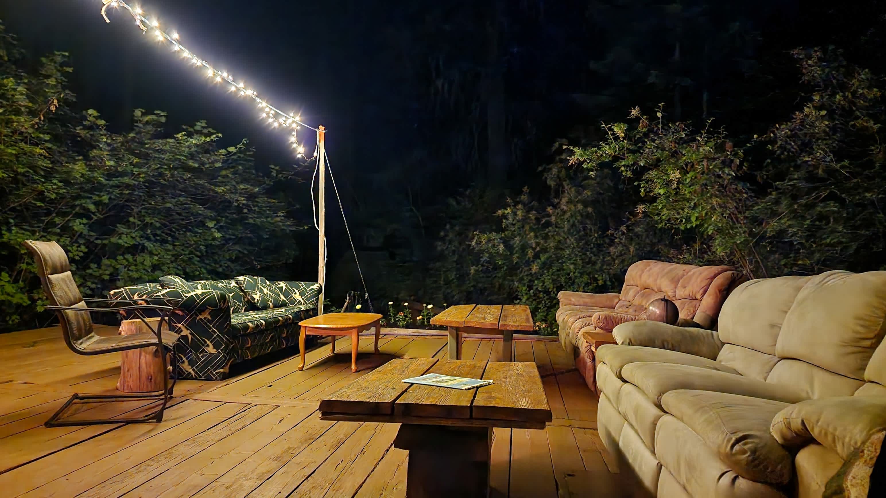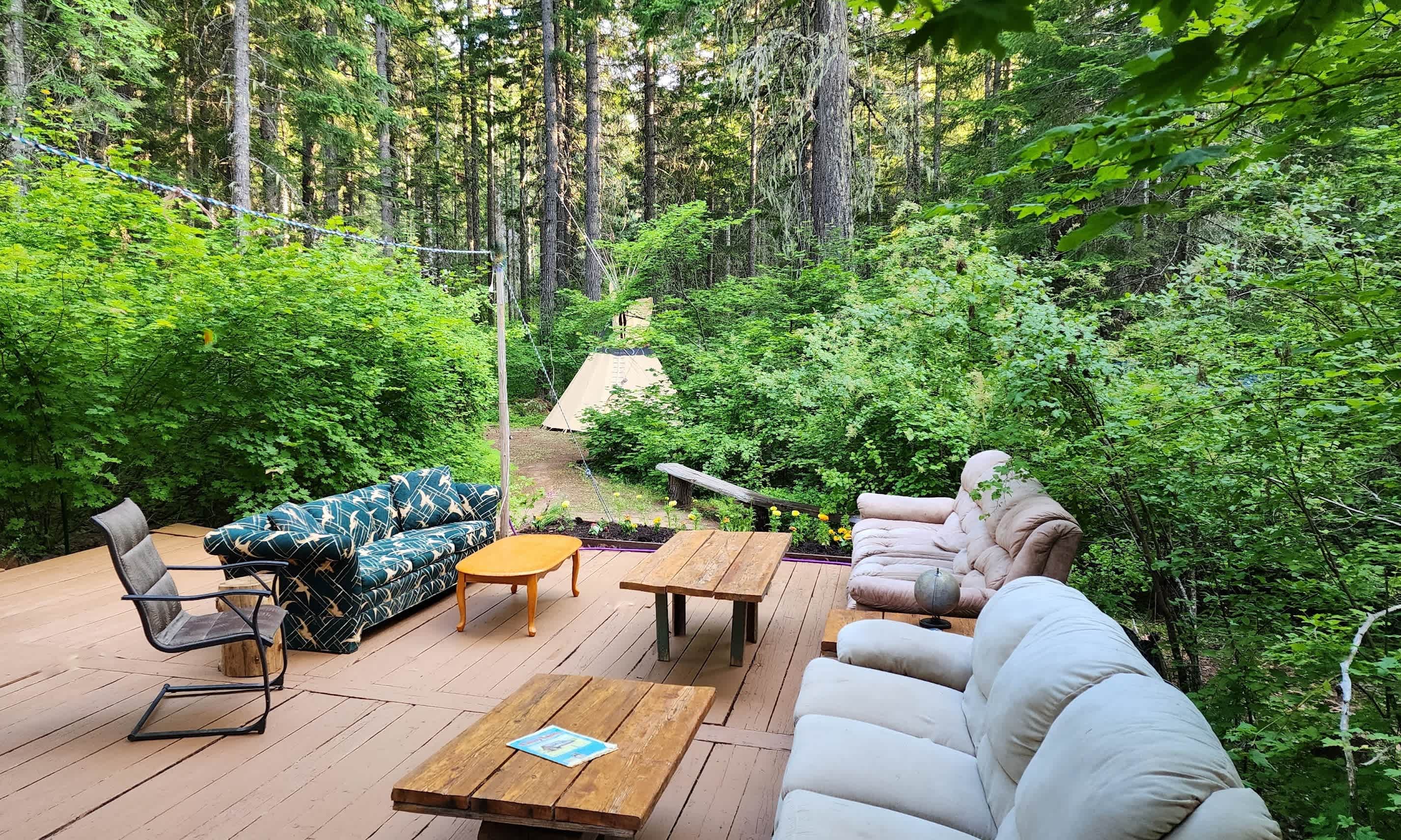 In a nut shell... You will experience the essence of glamping. The secluded outdoor camp is tucked underneath towering pines. It features a tipi with a queen bed, three tent cabins with trifold mattresses, an outdoor shower, a 400 sq. ft. deck, outdoor furniture, a fully equipped cookhouse with hot running water, and a cedar shake privy. Sheets, Pillows, and a Comforter are provided for the Queen Bed in the Tipi. For those overnighting in the tent cabins, you will need to bring your sleeping bag and pillow. More Information... HELLO! Jim Wells here… The following is information for your stay at the CASCADIA TIPI CAMP in Trout Lake. Additionally, you can find ideas, tips, and advice for discovering the nearby region. Okay, let's get started… Orientation and Walk Through… Stove Operation, Light / Electric Operation, Shower Operation, Recycling, Compost & Trash, Sink Disposal, Fire Extinguisher & First Aid Kit, The "Rose Room," If it rains…#!? Yellow Jackets, Mice & Bears, Property Boundaries Upon Checking Out (Notify Jimmy or Sally When You Depart -- Text or Stop by the House) In the event of a travel delay or last-minute questions, contact 509-637-6175 (Jim's Mobile Phone) Jim & Sally Wells 509-395-2553 (Home Phone), (509) 637-0038 (Sally's Mobile Phone) Emergency Telephone Number CALL 911 -- Emergency, Police, Fire, Equipment Rental (Best to pre-arrange rentals) Inflatable Kayaks - One or Two Seat Kayaks, Paddles, Pump, PFDs. They fit rolled up in the back of your car. $50 each per day. These are top-shelf AIRE LYNX or FORCE kayaks. Hard Shell Kayaks – Paddle and Spray Skirt - $50 per day. Strap to the top of the car. AIRE Raft -- 14' Raft with paddles and pump. 4 – 6 person capacity. $175 per day. FLOAT TUBES -- Available – FREE FOR CASCADIA TIPI CAMP GUESTS. General Guidelines / Camp Rules -- Don't park or walk or set stuff down on wild plants. Stay within the property boundaries. No Fires – A strict Burn Ban is in effect. Quiet time after 10:15 pm (IMPORTANT) Keep valuables locked in your car. (We've never had a theft problem in the 42 years we've lived here). Counters and tables should be clean and clear of open food to avoid attracting yellow jackets, bears, or mice. Bear spray and alert horn are located at both the Cook Shack and "Big Tree." Park your car in a designated TIPI CAMP parking spot. Our Top 10 Local Attractions 1) Raft Trip (Take a full-day whitewater raft trip down the White Salmon River. Contact Wet Planet or River Drifters – both are good companies. 2) Alpine Hike and Huckleberry Picking. (Drive up to Mt. Adams COLD SPRINGS for a hike above 6,000').3) Hike to the top of Sleeping Beauty (Located about a half-hour drive, you will find a trail to this fascinating volcanic plug. Hike to the top for an amazing view of the Trout Lake Valley and Mt. Adams). 4) Trout Lake Natural Area Preserve --(A close-by place to visit for a picnic or leisurely hike along Trout Creek. Don't miss the overlook spur that takes you up for a fantastic view of Mt. Adams and the Natural Area Preserve). 5) Secret Swimming Holes -- (For the Secrets, speak with Jimmy or Visit Trout Creek Swimming Holes and cool down / have fun. Located near the bridges that cross Trout Creek.) 6) Huckleberry Milkshakes -- (Visit the café at the Trout Lake Gas Station for these famous shakes or enjoy a specialty coffee). 7) Ice Caves and Natural Arches-- (Visit the Forest Service Ranger Station and get directions to these local natural wonders) 8) Bike Riding -- (Trout Lake has the best roads for riding. Explore the Trout Lake Valley by bike and view the organic farms and roadside views. Bring your bike!) 9) Mountain Lake Swimming, Fishing, and Picnicking -- (Visit the Forest Service Ranger Station and get directions to our local lakes, FORLORN, MOSQUITO, and GOOSE). 10) Tubing! We provide "state of the art" inner tubes to float around Mountain Lakes in the Gifford Pinchot National Forest. F A Q'S -- Let's start with bugs… In July / August, mosquitos on a 1 to 10 (ten being bad) it is about a 1 to 2… It's almost a non-factor. A few might show up around sundown, but they are not annoying. I don't even remember putting on mosquito repellant last summer. Sometimes, if it is extremely dry, you may have some yellow jackets that show up. But we are on to them now! We put up Yellow Jacket Traps around the Camp, drawing them away from the deck and Tipi. We also try to catch the Queen Bees early in the spring, which has really helped. Be vigilant not to leave food scraps, and that will reduce the yellow jacket visits. Bears… For the first time in all the years at the property, we had a bear invasion in 2022. It raided the refrigerator. All food must be appropriately stored in locked Aluminum River Boxes located in the cook shack and the lockable refrigerator. You will receive an orientation on responding if a bear wanders into the Tipi Camp by chance. Having operated three lodges in Alaska for over 25 years, I am prepared to provide helpful risk management information on Bear Prevention and Bear Encounters. What types of beds are there? In the Tipi, we have a Queen bed (two additional twin beds can be added if needed. In the cabin tents, expect a twin mattresses and tri-fold sleeping pads – they are 3 to 4" thick and are friendly to sleep on. The Cabin Tents (you can stand up in them) have Tri-fold foam mattress pads. Beds, mattresses, and foam mattress pads can be shuffled around to suit your needs. Enjoy a nice double-sized quilted hammock you might like to sleep or relax in. Additionally, you can set up your personal tent or hammock as you wish. How about bedding and nighttime temperatures? You'll need to bring your own bedding and/or sleeping bags and pillows for the Tent Cabins. Sheets, Pillows, and a comforter are provided for the Tipi queen bed. Nighttime temperatures are in the mid fifty's / 60's. Bringing an extra blanket or two is best; be prepared to take off that chill. How is the Kitch
