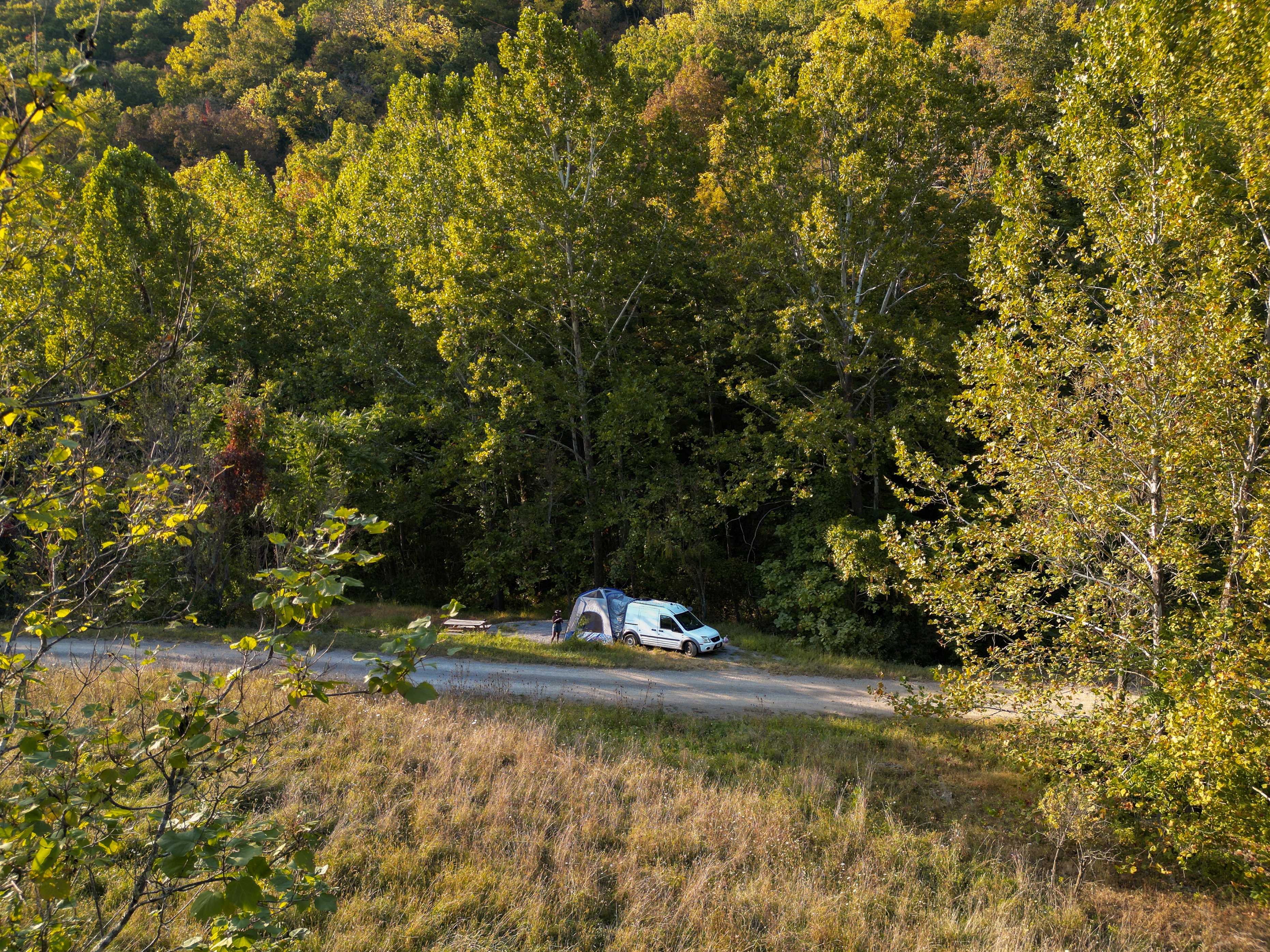 Two level terraces at the end of a gravel driveway, near the landowner's farmhouse. Enough space for several vehicles and/or tents, trailers, camper vans, etc. Next to a creek fed from a mountain spring, and has direct access to a private trail with a two-person swing and beautiful overlook of Seneca Rocks. This is also the campsite with the most night-sky views. The landowner lives in the nearby farmhouse, is quiet, and keeps to themselves. They can provide you with visitor wifi access when you arrive. Fires permitted in the designated fire ring. All trash must be packed out. No designated bathroom; must bring your own camping toilet. Picnic tables and fire ring located at the site.
