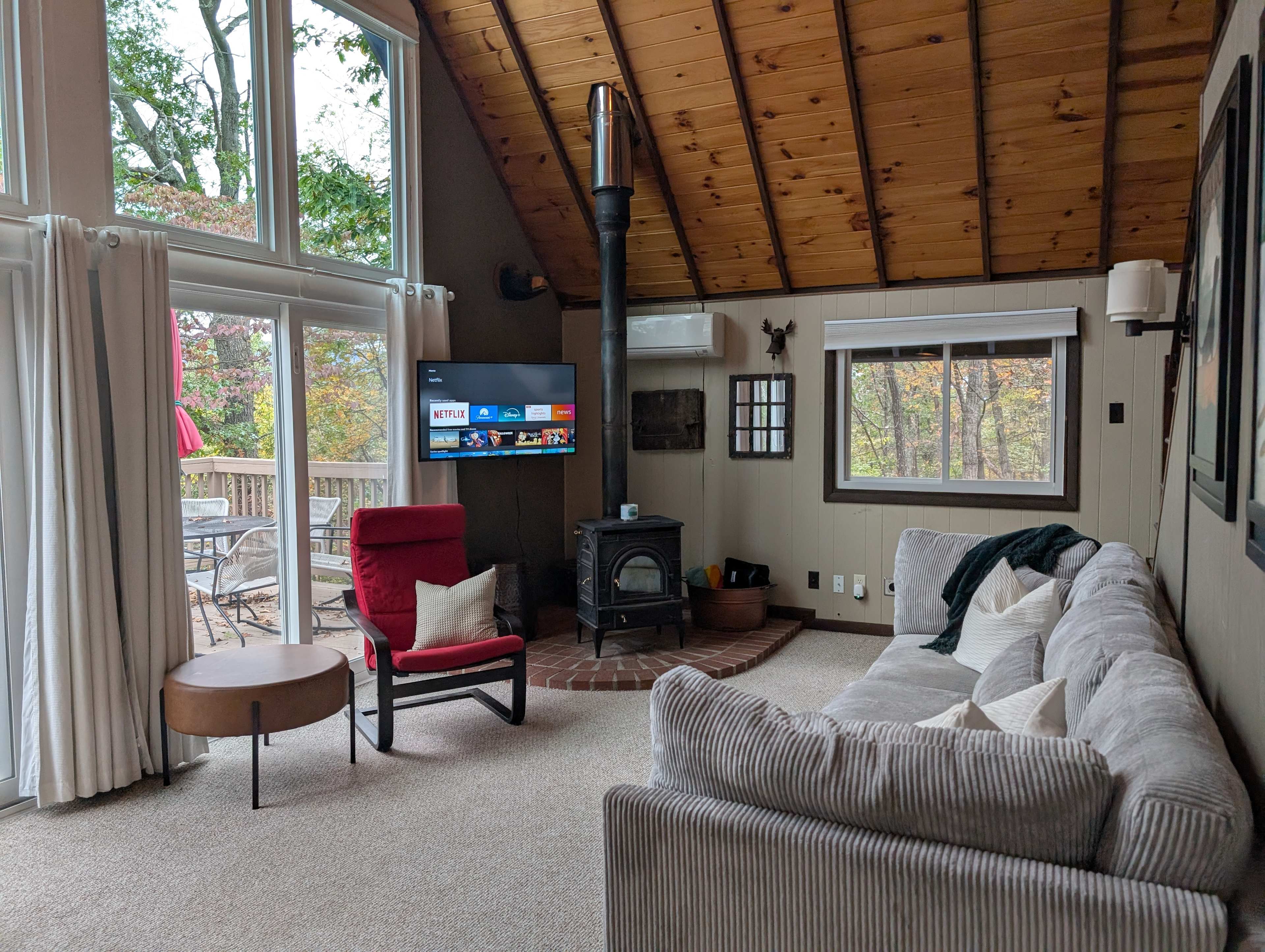 Our cabin is situated on 5 remote acres. As you step inside, there's an easy-to-access king bedroom off to your right and a full bathroom with shower on your left. The entry hall takes you into an open living room, kitchen, and dining room with an expansive wall of floor to ceiling windows looking over the valley below. Grab coffee from our stocked corner coffee station, or listen to some records or stream music from your phone to the record player/Bluetooth speaker. Head upstairs into the loft to find two semi-private bedrooms: one with a queen bed, and the other with a twin daybed and cozy reading nook. Step outside onto the expansive deck with a propane grill and gently rocking dining chairs — perfect to enjoy your dinner while watching the colorful sunset, or to sip your coffee in the early morning peace. Ready for a campfire? Head back out the front door and across the gravel driveway to find the fire pit surrounded by comfortable adirondack chairs... perfect for cooking s'mores under the string lights or sipping a drink while watching the sun sink below the horizon. To ensure you have a comfortable and informed stay, please note the following: ➡️ Connectivity: Our home is equipped with 1G fiber internet and a smart TV, so you can log into your favorite streaming services. ➡️ Wood Stove: The wood stove is currently inoperable and unavailable for guest use. ➡️ Security: For your safety and security, there are exterior security cameras on the property. ➡️ Wildlife & Bugs: Given our remote and natural location, bugs and mosquitoes are part of the experience. We treat the property professionally multiple times a year, but we recommend bringing bug spray with DEET. Looking for more to do? Cacapon Resort State Park is only 10 minutes away, and has a beautiful scenic overlook, pickleball and basketball courts, horseback riding, hiking, mountain biking, a spa, playground for kids, and much more.