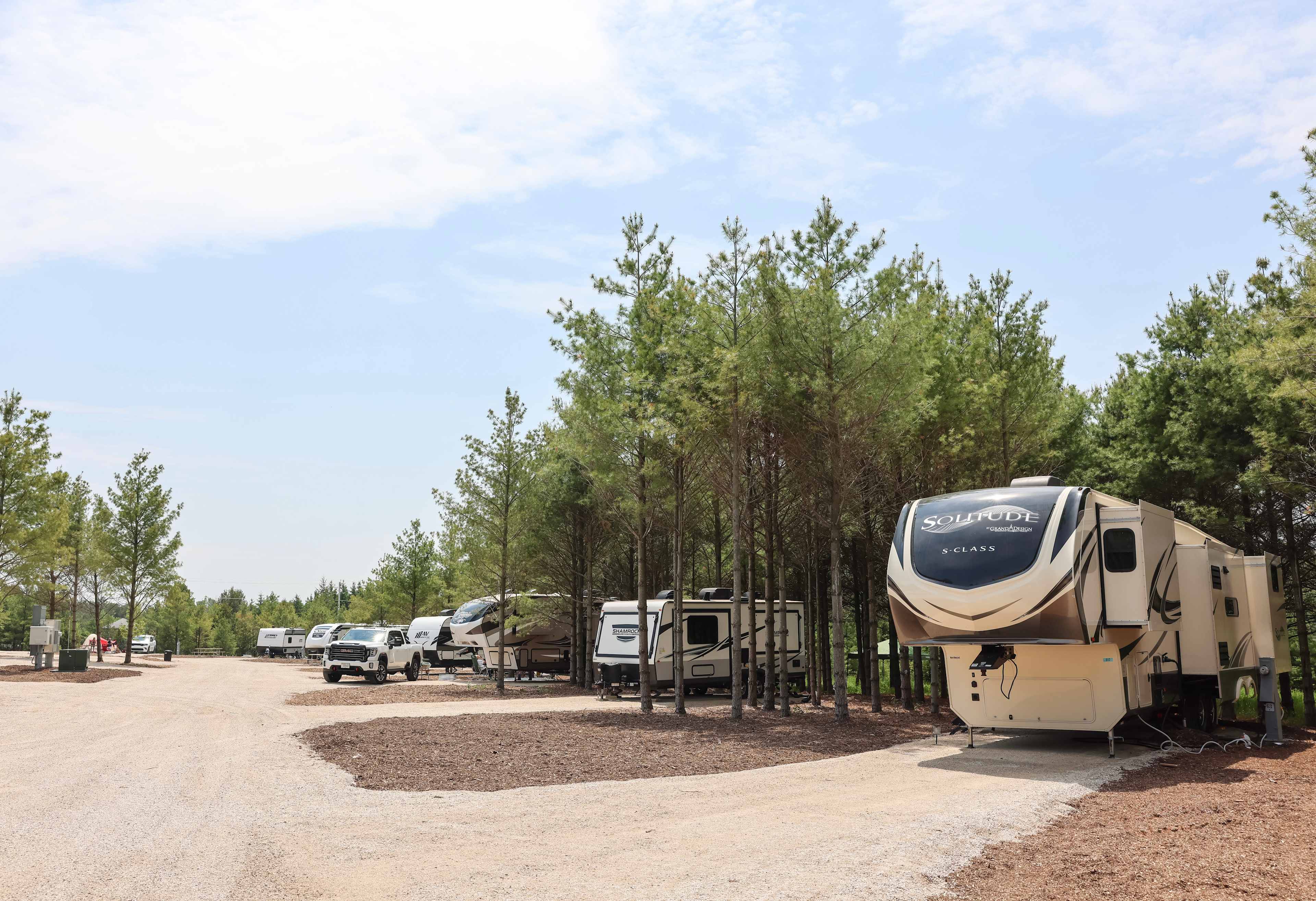 Spacious, level camping well-suited for travel trailers over 40 ft long.