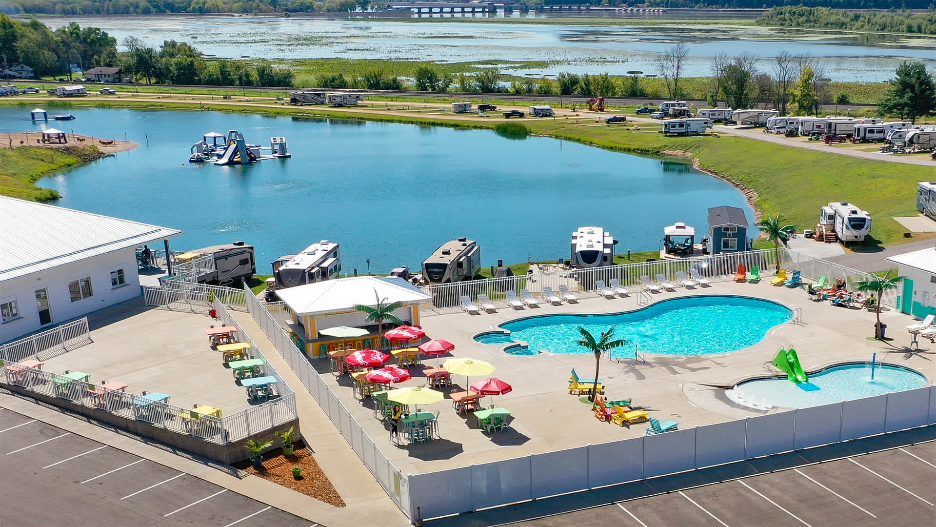 If you are looking for a Wisconsin camping experience unlike any other, Coconut Cove RV Resort in Hazel Green is the place for you. This resort-caliber campground overlooks the mighty Mississippi River, providing breathtaking views and a large variety of fun activities and amenities to enjoy. From our tropical-themed beachfront tiki bar to our floating aqua adventure park, Coconut Cove has exciting features for people of all ages. Located on Bluff Road in Hazel Green, WI, you’ll find that getting to Coconut Cove RV Resort from Dubuque, Rutledge, Jamestown, Louisburg, and other surrounding areas is a breeze. Whether you need a “day-cation” or a vacation, come see for yourself why Coconut Cove is the place to be.c