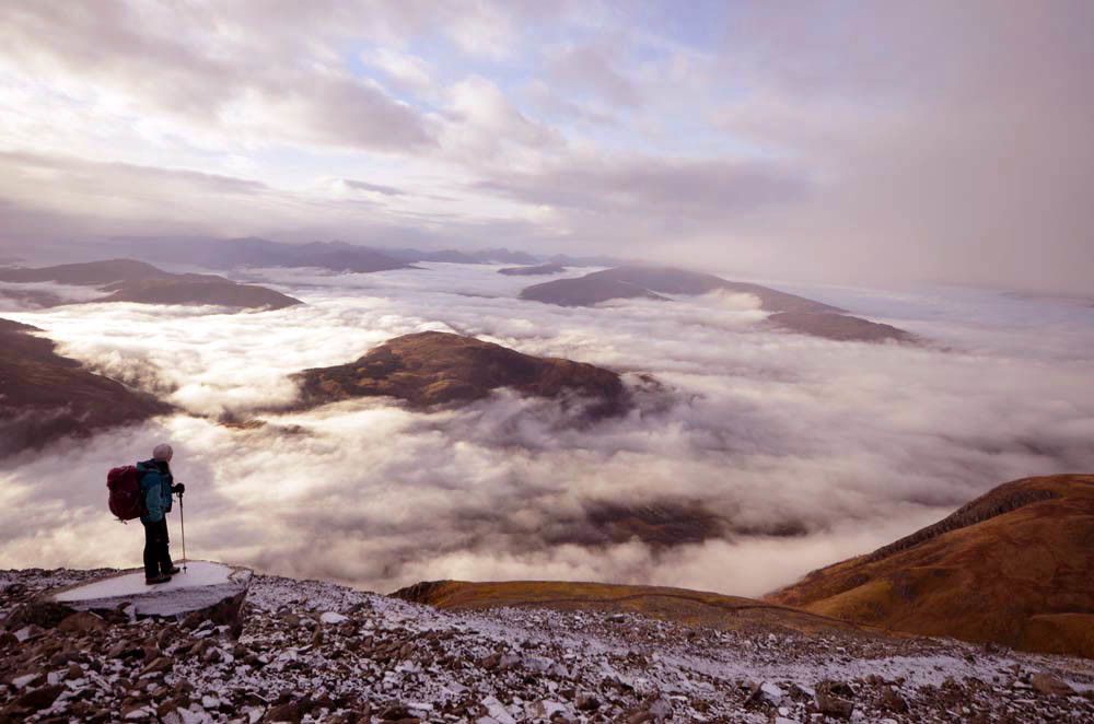 I packed away fast to take advantage of this situation. And so, while everyone else was still in bed, I was already half-way up the highest mountain in the UK. The higher I climbed the lighter it became and then, all of a sudden, the sun broke the clouds to reveal a wonderful and rare phenomenon—a cloud inversion. This is where the temperature up high is warmer than it is in the valley (usually it’s the opposite) causing the mist to linger lower down—an occurrence uncommon in summer, but much more likely in winter. From here I could spy a handful of hilltops peeking through the white clouds like islands in a fluffy sea.